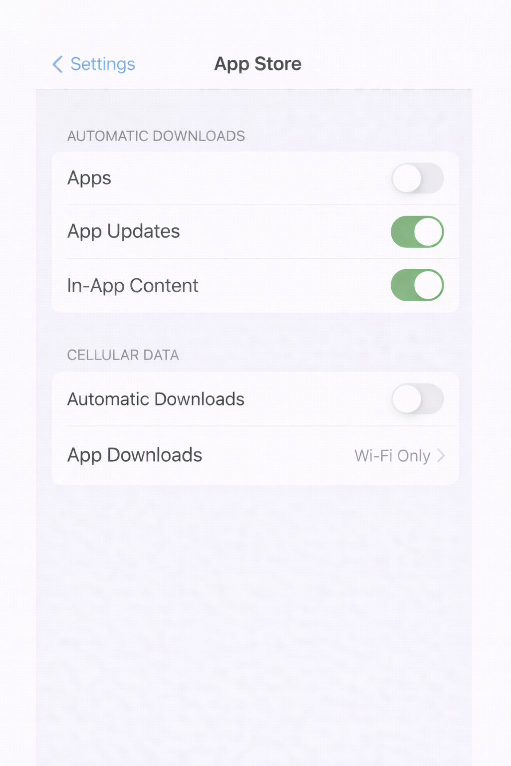 추가로 셀룰러 데이터에서도 자동 다운로드를 끄거나 “Wi-Fi만”으로 제한하세요.